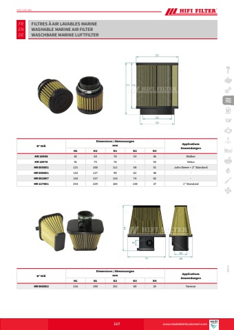 www.hifi-filter.comFILTRES %u00c0 AIR LAVABLES MARINEWASHABLE MARINE AIR FILTERWASCHBARE MARINE LUFTFILTERFRENDEHPE 3701-001117N%u00b0 HifiDimensions / Abmessungenmm ApplicationsAnwendungenH1 D1 D2 D3 D4HR 060502 216 190 151 60 25 YanmarN%u00b0 HifiDimensions / Abmessungenmm ApplicationsAnwendungenH1 H2 D1 D2 D3HR 16904 81 63 76 53 46 WalkerHR 16976 91 75 76 - 53 VetusHR 055001 121 100 111 58 51 John Deere + 2\HR 048401 142 127 90 62 48 -HR 062407 142 127 114 74 62 -HR 127401 254 229 165 138 27 1\www.madedistribuzionesrl.com