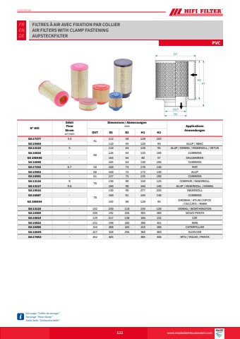 www.hifi-filter.comFILTRES %u00c0 AIR AVEC FIXATION PAR COLLIERAIR FILTERS WITH CLAMP FASTENINGAUFSTECKFILTERFRENDEAIR 0209-005PVC122N%u00b0 HifiD%u00e9bitFlowStromm3/minDimensions / Abmessungenmm ApplicationsAnwendungen OUT D1 D2 H1 H2SA 17377 3.441112 58 128 103 -SA 19464 - 110 59 120 95 ALUP / ABACSA 13115 550110 64 120 95 ALUP / DEMAG / INGERSOLL / VETUSSA 16816 - 126 64 135 100 CUMMINSSA 190445 - 164 64 80 57 DALGAKIRANSA 16690 - 165 64 130 100 CUMMINSSA 17332 6.7 58 160 74 170 140 FIATSA 19463 - 60 160 72 172 140 ALUPSA 16501 - 61 127 75 135 100 CUMMINSSA 13116 976130 90 150 125 COMPAIR / INGERSOLLSA 13117 9.8 160 90 164 140 ALUP / INGERSOLL / DEMAGSA 19516 -78130 90 277 250 INGERSOLLSA 16687 - 160 91 165 140 CUMMINSSA 190494 - 192 98 128 95 EKOMAK / ATLAS COPCO/ CECCATO / MARKSA 13118 - 102 230 118 155 120 DEMAG / WORTHINGTONSA 16465 - 104 192 106 305 280 VOLVO PENTASA 16814 - 129 217 138 166 132 CATSA 16815 - 151 198 160 380 341 MANSA 16450 - 154 268 165 210 180 CATERPILLARSA 16649 - 217 328 236 360 300 GUASCORSA 17443 - 252 425 - 405 336 MTU / VOLVO / PENTAVoir page \See page \Siehe Seite \www.madedistribuzionesrl.com
