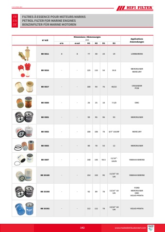 www.hifi-filter.comFILTRES %u00c0 ESSENCE POUR MOTEURS MARINSPETROL FILTER FOR MARINE ENGINESBENZINFILTER F%u00dcR MARINE MOTORENFRENDECAR 0900-002142N%u00b0 HifiDimensions / Abmessungenmm ApplicationsAnwendungen %u00f8 in %u00f8 out H1 H2 D1 D2BE 5011 8 8 77 40 24 19 LOMBARDINIBE 5016 - - 125 115 54 34.8 MERCRUISERMERCURYBE 5017 - - 100 94 76 40/22 CRUSADERPCMBE 5500 - - 26 25 18 7.5/0 OMCBE 5501 - - 99 95 96 93 MERCRUISERBE 5502 - - 108 106 78 3/4\MERCURYBE 5503 - - 80 78 53 12 MERCRUISERBE 5507 - - 148 145 94.5 11/16\-16UN YAMAHA MARINEBE 25185 - - 154 152 95 11/16\-16 UN YAMAHA MARINEBE 33350 - - 92 89 78 13/16\-18 UNFORDMERCRUISEROMC VOLVO-PENTABE 33351 - - 112 111 78 13/16\-18 UN VOLVO-PENTAwww.madedistribuzionesrl.com