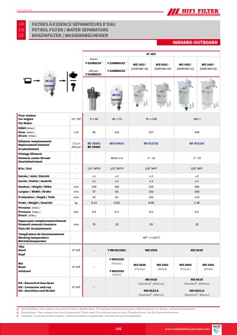 www.hifi-filter.comFILTRES %u00c0 ESSENCE S%u00c9PARATEURS D'EAUPETROL FILTER / WATER SEPARATORSBENZINFILTER / WASSERABSCHEIDERFRENDECAR 1001-012INBOARD-OUTBOARD146N%u00b0 Hifi10 %u00b5m :Y 025RAC02 1250 %u00b5m :Y 025RAC01 1Y 120RRAC01 2Y 120RRAC02 1MO 1431 2(320R-RAC-01)MO 1432 1(320R-RAC-02)MO 1461 2(660R-RAC-01)MO 1462 1(660R-RAC-02)Pour moteurFor engineF%u00fcr MotorCV / HP 0 %u2192 40 40 %u2192 75 75 %u2192 150 150 %u2192D%u00e9bit (max.)Flow (max.)Strom (max.)L/H 95 114 227 340El%u00e9ment remplacement Replacement elementErsatzelement10 %u00b5m250 %u00b5mBE 25081BE 25080BE 924010 BE 922710 BE 923210Filetage %u00e9l%u00e9mentElement center threadGewindeelement- - M18 x 1.5 1\1\%u00d8 In / Out - 1/4\ 1/4\3/8\3/8\Entr%u00e9e / Inlet / Eintritt - x 1 x 2 x 2 x 2Sortie / Outlet / Austritt - x 1 x 2 x 2 x 2Hauteur / Height / H%u00f6he mm 109 166 238 280Largeur / Width / Breite mm 57 81 102 106Profondeur / Depth / Tiefe mm 53 81 102 114Poids / Weight / Gewicht kg 0.14 0.50 0.90 1.40Pression (max.)Pressure (max.)Druck (max.)bar 6.9 0.5 0.5 0.5Espace pour remplacement elementElement removal clearancePlatz f%u00fcr Ersatzelementmm 75 25 25 25Temp%u00e9rature de fonctionnement Working temperatureBetriebstemperatur - -40%u00ba %u2192 +121%u00baCT%u00eateHeadKopfN%u00b0 Hifi - Y RK1021401 MO 2034 MO 2034BolBowlSch%u00fcsselN%u00b0 Hifi -Y RK10222(Plastic) Y RK10553(Metal)MO 3600(Plastic)MO 3601(Metal)MO 3600(Plastic)MO 3601(Metal)Kit : Raccord et bouchonsKit : Connector and capKit : Anschluss und DeckelN%u00b0 Hifi -MO 6610(Standard3 : %u00d810mm)MO 6622 A(Standard3 : %u00d88mm)MO 6610(Standard3 : %u00d810mm)MO 6622 A(Standard3 : %u00d88mm)1. Bol m%u00e9tallique : Pour moteurs hors-bord et %u00e0 bord / Metallic bowl : For outboard and inboard engines / Metallsch%u00fcssel : F%u00fcr Aussen- und Innenbordmotoren2. Bol plastique : Pour moteurs hors-bord uniquement / Plastic bowl :For outboard engines only / Plastiksch%u00fcssel : Nur f%u00fcr Aussenbordmotoren3. Standard = Livr%u00e9 avec le filtre complet / Delivered with the complete filter / Geliefert mit dem Komplettfilterwww.madedistribuzionesrl.com