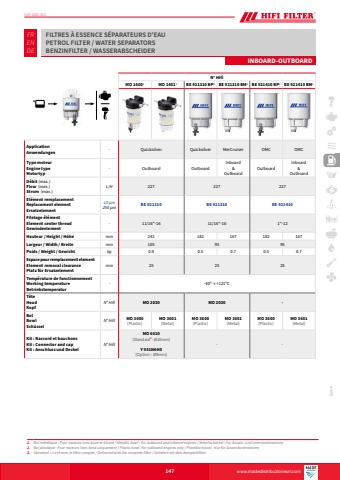 www.hifi-filter.comFILTRES %u00c0 ESSENCE S%u00c9PARATEURS D'EAUPETROL FILTER / WATER SEPARATORSBENZINFILTER / WASSERABSCHEIDERFRENDECAR 1001-012INBOARD-OUTBOARD147N%u00b0 HifiMO 14002 MO 14011 BE 921310 BP2 BE 921310 BM1 BE 921410 BP2 BE 921410 BM1ApplicationAnwendungen - Quicksilver Quicksilver MerCruiser OMC OMCType moteurEngine typeMotortyp- Outboard OutboardInboard&OutboardOutboardInboard&OutboardD%u00e9bit (max.)Flow (max.)Strom (max.)L/H 227 227 227El%u00e9ment remplacement Replacement elementErsatzelement10 %u00b5m250 %u00b5m BE 921310 BE 921310 BE 921410Filetage %u00e9l%u00e9mentElement center threadGewindeelement- 11/16\11/16\1\Hauteur / Height / H%u00f6he mm 242 182 167 182 167Largeur / Width / Breite mm 105 95 95Poids / Weight / Gewicht kg 0.9 0.5 0.7 0.5 0.7Espace pour remplacement elementElement removal clearancePlatz f%u00fcr Ersatzelementmm 25 25 25Temp%u00e9rature de fonctionnement Working temperatureBetriebstemperatur - -40%u00ba %u2192 +121%u00baCT%u00eateHeadKopfN%u00b0 Hifi MO 2030 MO 2030 -BolBowlSch%u00fcsselN%u00b0 Hifi MO 3600(Plastic)MO 3601(Metal)MO 3600(Plastic)MO 3601(Metal)MO 3600(Plastic)MO 3601(Metal)Kit : Raccord et bouchonsKit : Connector and capKit : Anschluss und DeckelN%u00b0 HifiMO 6610(Standard3 : %u00d810mm)Y 951N6H5(Option : %u00d88mm)- -1. Bol m%u00e9tallique : Pour moteurs hors-bord et %u00e0 bord / Metallic bowl : For outboard and inboard engines / Metallsch%u00fcssel : F%u00fcr Aussen- und Innenbordmotoren2. Bol plastique : Pour moteurs hors-bord uniquement / Plastic bowl :For outboard engines only / Plastiksch%u00fcssel : Nur f%u00fcr Aussenbordmotoren3. Standard = Livr%u00e9 avec le filtre complet / Delivered with the complete filter / Geliefert mit dem Komplettfilterwww.madedistribuzionesrl.com