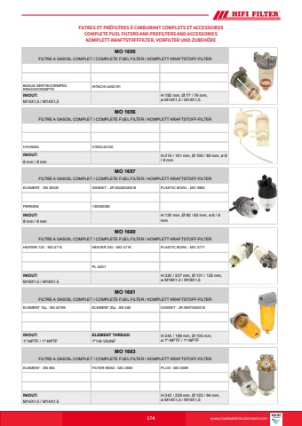 www.hifi-filter.comFILTRES ET PR%u00c9FILTRES %u00c0 CARBURANT COMPLETS ET ACCESSOIRESCOMPLETE FUEL FILTERS AND PREFILTERS AND ACCESSORIESKOMPLETT-KRAFTSTOFFFILTER, VORFILTER UND ZUBEH%u00d6RE174M14X1,5 / M14X1,5IN/OUT:MO 1655FILTRE A GASOIL COMPLET / COMPLETE FUEL FILTER / KOMPLETT KRAFTSTOFF-FILTERBAGUE SERTIE/CRIMPED RING/GECRIMPTE HITACHI 4452161H:182 mm, %u00d8:77 / 76 mm, %u00f8:M14X1,5 / M14X1,58 mm / 8 mmIN/OUT:MO 1656FILTRE A GASOIL COMPLET / COMPLETE FUEL FILTER / KOMPLETT KRAFTSTOFF-FILTERHYUNDAI 31920-45100H:215 / 161 mm, %u00d8:100 / 80 mm, %u00f8:8 / 8 mm8 mm / 8 mmIN/OUT:MO 1657FILTRE A GASOIL COMPLET / COMPLETE FUEL FILTER / KOMPLETT KRAFTSTOFF-FILTERELEMENT : SN 30035 GASKET : JR 054000200 B PLASTIC BOWL : MO 3665PERKINS 130306380H:130 mm, %u00d8:92 / 62 mm, %u00f8:8 / 8 mmM18X1,5 / M18X1,5IN/OUT:MO 1660FILTRE A GASOIL COMPLET / COMPLETE FUEL FILTER / KOMPLETT KRAFTSTOFF-FILTERHEATER 12V : MO 4715 HEATER 24V : MO 4716 PLASTIC BOWL : MO 3717PL 420/1H:320 / 237 mm, %u00d8:131 / 125 mm, %u00f8:M18X1,5 / M18X1,51\IN/OUT: ELEMENT THREAD:1\MO 1661FILTRE A GASOIL COMPLET / COMPLETE FUEL FILTER / KOMPLETT KRAFTSTOFF-FILTERELEMENT 10%u00b5 : SN 40195 ELEMENT 20%u00b5 : SN 246 GASKET : JR 085700400 BH:240 / 198 mm, %u00d8:105 mm, %u00f8:1\M14X1,5 / M14X1,5IN/OUT:MO 1663FILTRE A GASOIL COMPLET / COMPLETE FUEL FILTER / KOMPLETT KRAFTSTOFF-FILTERELEMENT : SN 565 FILTER HEAD : MO 2630 PLUG : MO 6599H:242 / 228 mm, %u00d8:122 / 94 mm, %u00f8:M14X1,5 / M14X1,5www.madedistribuzionesrl.com