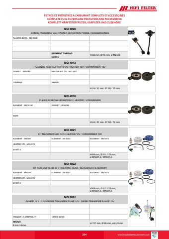 www.hifi-filter.comFILTRES ET PR%u00c9FILTRES %u00c0 CARBURANT COMPLETS ET ACCESSOIRESCOMPLETE FUEL FILTERS AND PREFILTERS AND ACCESSORIESKOMPLETT-KRAFTSTOFFFILTER, VORFILTER UND ZUBEH%u00d6RE204ELEMENT THREAD:M24X5MO 4900SONDE PRESENCE EAU / WATER DETECTION PROBE / WASSERSONDEPLASTIC BOWL : MO 3900H:50 mm, %u00d8:75 mm, %u00f8:M24X5MO 4913FLASQUE RECHAUFFANTE12V / HEATER 12V / VORW%u00c4RMER 12VGASKET : 3834185 HEATER KIT 12V : MO 4921CUMMINS 3944267H:24 / 21 mm, %u00d8:100 / 75 mmMO 4916FLASQUE RECHAUFFANTE24V / HEATER / VORW%u00c4RMERELEMENT : SN 25162 GASKET : 3834185300WH:24 / 21 mm, %u00d8:100 / 75 mmMO 4921KIT RECHAUFFEUR 12 V / HEATER 12V / VORW%u00c4RMER 12VELEMENT : SN 039 ELEMENT : SN 5052 ELEMENT : SN 5074HEATER 12V : MO 4913M16X1.5H:68 mm, %u00d8:113 / 75 mm, %u00f8:M16X1,5 / M16X1,5MO 4922KIT RECHAUFFEUR 24 V / HEATING HEAD / BEHEIZTER-FILTERKOPFELEMENT : SN 039 ELEMENT : SN 5052 ELEMENT : SN 5074HEATER 24V : MO 4916M16X1.5H:68 mm, %u00d8:113 / 75 mm, %u00f8:M16X1,5 / M16X1,58 mm / 8 mmIN/OUT:MO 5001POMPE 12 V / 12 V DIESEL TRANSFER PUMP 12V / DIESELTRANSFER PUMPE 12VYANMAR - 1.5AMP/60L/H 129612-52100H:127 mm, %u00d8:65 mm, %u00f8:8 / 8 mmwww.madedistribuzionesrl.com