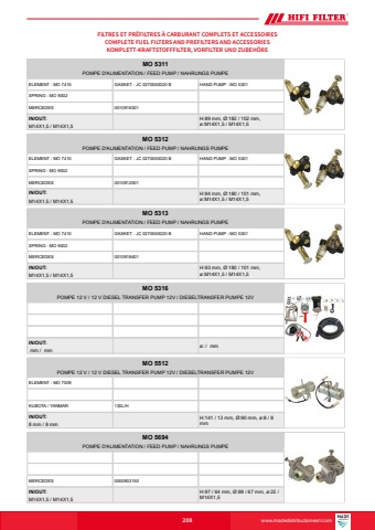 www.hifi-filter.comFILTRES ET PR%u00c9FILTRES %u00c0 CARBURANT COMPLETS ET ACCESSOIRESCOMPLETE FUEL FILTERS AND PREFILTERS AND ACCESSORIESKOMPLETT-KRAFTSTOFFFILTER, VORFILTER UND ZUBEH%u00d6RE208M14X1,5 / M14X1,5IN/OUT:MO 5311POMPE D'ALIMENTATION / FEED PUMP / NAHRUNGS PUMPEELEMENT : MO 7410 GASKET : JC 0270050020 B HAND PUMP : MO 5301SPRING : MO 9002MERCEDES 0010916301H:89 mm, %u00d8:182 / 102 mm, %u00f8:M14X1,5 / M14X1,5M14X1,5 / M14X1,5IN/OUT:MO 5312POMPE D'ALIMENTATION / FEED PUMP / NAHRUNGS PUMPEELEMENT : MO 7410 GASKET : JC 0270050020 B HAND PUMP : MO 5301SPRING : MO 9002MERCEDES 0010912501H:94 mm, %u00d8:180 / 101 mm, %u00f8:M14X1,5 / M14X1,5M14X1,5 / M14X1,5IN/OUT:MO 5313POMPE D'ALIMENTATION / FEED PUMP / NAHRUNGS PUMPEELEMENT : MO 7410 GASKET : JC 0270050020 B HAND PUMP : MO 5301SPRING : MO 9002MERCEDES 0010918401H:93 mm, %u00d8:180 / 101 mm, %u00f8:M14X1,5 / M14X1,5 mm / mmIN/OUT:MO 5316POMPE 12 V / 12 V DIESEL TRANSFER PUMP 12V / DIESELTRANSFER PUMPE 12V%u00f8: / mm8 mm / 8 mmIN/OUT:MO 5512POMPE 12 V / 12 V DIESEL TRANSFER PUMP 12V / DIESELTRANSFER PUMPE 12VELEMENT : MO 7009KUBOTA / YANMAR 130L/HH:141 / 13 mm, %u00d8:90 mm, %u00f8:8 / 8 mmM14X1,5 / M14X1,5IN/OUT:MO 5694POMPE D'ALIMENTATION / FEED PUMP / NAHRUNGS PUMPEMERCEDES 0000903150H:97 / 64 mm, %u00d8:89 / 67 mm, %u00f8:22 / M14X1,5www.madedistribuzionesrl.com