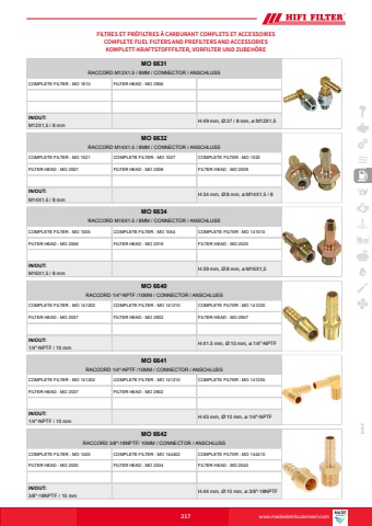 www.hifi-filter.comFILTRES ET PR%u00c9FILTRES %u00c0 CARBURANT COMPLETS ET ACCESSOIRESCOMPLETE FUEL FILTERS AND PREFILTERS AND ACCESSORIESKOMPLETT-KRAFTSTOFFFILTER, VORFILTER UND ZUBEH%u00d6RE217M12X1,5 / 8 mmIN/OUT:MO 6631RACCORD M12X1.5 / 8MM / CONNECTOR / ANSCHLUSSCOMPLETE FILTER : MO 1610 FILTER HEAD : MO 2906H:49 mm, %u00d8:37 / 8 mm, %u00f8:M12X1,5M14X1,5 / 8 mmIN/OUT:MO 6632RACCORD M14X1.5 / 8MM / CONNECTOR / ANSCHLUSSCOMPLETE FILTER : MO 1021 COMPLETE FILTER : MO 1027 COMPLETE FILTER : MO 1032FILTER HEAD : MO 2007 FILTER HEAD : MO 2008 FILTER HEAD : MO 2009H:34 mm, %u00d8:8 mm, %u00f8:M14X1,5 / 8M16X1,5 / 8 mmIN/OUT:MO 6634RACCORD M16X1.5 / 8MM / CONNECTOR / ANSCHLUSSCOMPLETE FILTER : MO 1005 COMPLETE FILTER : MO 1054 COMPLETE FILTER : MO 141510FILTER HEAD : MO 2006 FILTER HEAD : MO 2019 FILTER HEAD : MO 2020H:39 mm, %u00d8:8 mm, %u00f8:M16X1,51/4\IN/OUT:MO 6640RACCORD 1/4\COMPLETE FILTER : MO 141202 COMPLETE FILTER : MO 141210 COMPLETE FILTER : MO 141230FILTER HEAD : MO 2037 FILTER HEAD : MO 2902 FILTER HEAD : MO 2907H:41.5 mm, %u00d8:10 mm, %u00f8:1/4\1/4\IN/OUT:MO 6641RACCORD 1/4\COMPLETE FILTER : MO 141202 COMPLETE FILTER : MO 141210 COMPLETE FILTER : MO 141230FILTER HEAD : MO 2037 FILTER HEAD : MO 2902H:45 mm, %u00d8:10 mm, %u00f8:1/4\3/8\IN/OUT:MO 6642RACCORD 3/8\COMPLETE FILTER : MO 1400 COMPLETE FILTER : MO 144402 COMPLETE FILTER : MO 144410FILTER HEAD : MO 2030 FILTER HEAD : MO 2034 FILTER HEAD : MO 2040H:44 mm, %u00d8:10 mm, %u00f8:3/8\www.madedistribuzionesrl.com