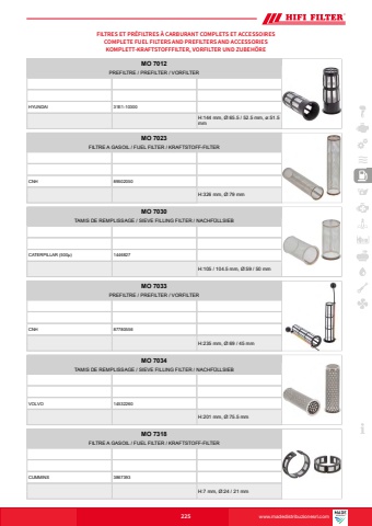 www.hifi-filter.comFILTRES ET PR%u00c9FILTRES %u00c0 CARBURANT COMPLETS ET ACCESSOIRESCOMPLETE FUEL FILTERS AND PREFILTERS AND ACCESSORIESKOMPLETT-KRAFTSTOFFFILTER, VORFILTER UND ZUBEH%u00d6RE225MO 7012PREFILTRE / PREFILTER / VORFILTERHYUNDAI 31E1-10300H:144 mm, %u00d8:65.5 / 52.5 mm, %u00f8:51.5 mmMO 7023FILTRE A GASOIL / FUEL FILTER / KRAFTSTOFF-FILTERH:326 mm, %u00d8:79 mmMO 7030TAMIS DE REMPLISSAGE / SIEVE FILLING FILTER / NACHF%u00dcLLSIEBCATERPILLAR (500%u00b5) 1446827H:105 / 104.5 mm, %u00d8:59 / 50 mmMO 7033PREFILTRE / PREFILTER / VORFILTERH:235 mm, %u00d8:69 / 45 mmMO 7034TAMIS DE REMPLISSAGE / SIEVE FILLING FILTER / NACHF%u00dcLLSIEBH:201 mm, %u00d8:75.5 mmMO 7318FILTRE A GASOIL / FUEL FILTER / KRAFTSTOFF-FILTERH:7 mm, %u00d8:24 / 21 mmCNH 89502050CNH 87780556VOLVO 14532260CUMMINS 3867393www.madedistribuzionesrl.com
