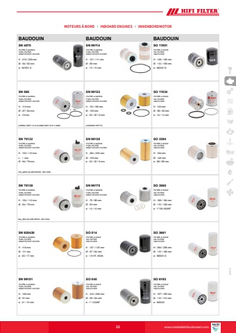 www.hifi-filter.comMOTEURS %u00c0 BORD I INBOARD ENGINES I INNENBORDMOTOR23BAUDOUINSN 4070FILTRE A GASOILFUEL FILTERKRAFTSTOFF-FILTERH : 210 / 209 mm%u00d8 : 94 / 92 mm%u00f8 : M16X1,5BAUDOUINSN 99114FILTRE A GASOILFUEL FILTERKRAFTSTOFF-FILTERH : 121 / 111 mm%u00d8 : 80 mm%u00f8 : 15 / 15 mmBAUDOUINSO 11001FILTRE A HUILEOIL FILTEROELFILTERH : 148 / 146 mm%u00d8 : 112 / 109 mm%u00f8 : M24X1,5JORING DINT=14 S=2,5MM DINT=6 S=1,5MMSN 565FILTRE A GASOILFUEL FILTERKRAFTSTOFF-FILTERH : 110 mm%u00d8 : 87 / 84 mm%u00f8 : 19 mm(1GRAND/1PETIT)SN 99122FILTRE A GASOILFUEL FILTERKRAFTSTOFF-FILTERH : 101 / 98 mm%u00d8 : 105 mm%u00f8 : 32 / 32 / 0 mmSO 11034FILTRE A HUILEOIL FILTEROELFILTERH : 120 mm%u00d8 : 98 / 92 mm%u00f8 : 14 / 14 mm150_%u00b5BOL/GLASS BOWL :MO 3254SN 70132FILTRE A GASOILFUEL FILTERKRAFTSTOFF-FILTERH : 153 / 110 mmL : / mm%u00d8 : 84 / 79 mmSN 99130FILTRE A GASOILFUEL FILTERKRAFTSTOFF-FILTERH : 204 / 200 mm%u00d8 : 105 mm%u00f8 : 32 / 32 / 0 mmSO 3394FILTRE A HUILEOIL FILTEROELFILTERH : 164 mm%u00d8 : 148 mm%u00f8 : 88 / 88 mm30%u00b5_BOL/GLASS BOWL :MO 3254SN 70138FILTRE A GASOILFUEL FILTERKRAFTSTOFF-FILTERH : 154 / 112 mm%u00d8 : 84 / 79 mmSN 99170FILTRE A GASOILFUEL FILTERKRAFTSTOFF-FILTERH : 75 / 68 mm%u00d8 : 63 mm%u00f8 : 14 / 14 mmSO 3565FILTRE A HUILEOIL FILTEROELFILTERH : 186 / 184 mm%u00d8 : 112 / 109 mm%u00f8 : 1\SN 920430FILTRE A GASOILFUEL FILTERKRAFTSTOFF-FILTERH : 118 mm%u00d8 : 111 mm%u00f8 : 20 / 17 mmSO 014FILTRE A HUILEOIL FILTEROELFILTERH : 137 / 135 mm%u00d8 : 97 / 94 mm%u00f8 : 13/16\SO 3661FILTRE A HUILEOIL FILTEROELFILTERH : 260 / 258 mm%u00d8 : 110 / 108 mm%u00f8 : M30X1,5SN 99101FILTRE A GASOILFUEL FILTERKRAFTSTOFF-FILTERH : 109 mm%u00d8 : 81 mm%u00f8 : 21 / 10 mmSO 040FILTRE A HUILEOIL FILTEROELFILTERH : 210 / 208 mm%u00d8 : 95 / 94 mm%u00f8 : 1\SO 6193FILTRE A HUILEOIL FILTEROELFILTERH : 197 / 195 mm%u00d8 : 112 / 110 mm%u00f8 : M30X2www.madedistribuzionesrl.com