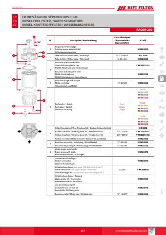 www.hifi-filter.comFILTRES %u00c0 GASOIL S%u00c9PARATEURS D'EAUDIESEL FUEL FILTER / WATER SEPARATORSDIESEL-KRAFTSTOFFFILTER / WASSERABSCHEIDERFRENDECAR 1001-015RACOR 200257N%u00b0 Description / BeschreibungCaract%u00e9ristiquesCharacteristicsEigenschaftenN%u00b0 Hifi1Kit pompe d'amor%u00e7agePriming pump assembly kitKit AnsaugungspumpeY RK200252 T%u00eate de filtre / Filter head / Filterkopf %u00bc\ - 18 NPTF MO 2039T%u00eate de filtre / Filter head / Filterkopf M 14 x 1.5 Y RK200493Bouchon plastique et billeCheck ball and plastic capPlastik-Abschluss und KontrollaugeY RK20011-01Bouchon m%u00e9tallique et billeMetal check ball capMetall-Abschluss mit KontrollaugeY RK207424Bouchon purge m%u00e9talliqueMetal vent plugAblassdeckel aus Metall%u215c\Y RK101105Cartouche + JointsCartridge + GasketEinsatz + Dichtung2 %u00b5m10 %u00b5m30 %u00b5mY 215R :SN 901502 SN 901510 SN 901530Y 230R :SN 902002 SN 902010 SN 902030Y 245R :SN 902502 SN 902510 SN 9025306Kit bol transparent / See-thru bowl kit / Becken-Kit durchsichtig MO 3002Kit bol chauffant / Heating bowl kit / Heizbecken-Kit 12V / 200 W Y RK22354-01Kit bol chauffant / Heating bowl kit / Heizbecken-Kit 24V / 200 W Y RK22354-02Kit bol en m%u00e9tal / Metal bowl kit / Becken-Kit aus Metall Y RK223687 Bouchon en m%u00e9tal / Metal plug / Metalldeckel %u00bd\-20 SAE Y RK20022Bouchon en plastique / Plastic plug / Plastikdeckel %u00bd\Y RK201268Vis de purge avec jointsDrain screw with sealsAblassschraube mit DichtungenY RK30476-Connecteur chauffageHeater connectorW%u00e4rmer-AnschliesserY RK30876Kit d%u00e9tecteur d'eau (Voir page \Water sensor Kit (See page \Wasseranzeiger Kit (Siehe Seite \12/24V Y RK30880EKit d%u00e9tecteur d'eau + Raccord Water probe kit + ConnectorWassersensor Kit + AnschlussY RK30964Jeu de joints completComplete seal service kitKompletter DichtungssatzY RK20075Bouchon m%u00e9tal / Metal plug / Metalldeckel %u00bc\Y RK1204132451876www.madedistribuzionesrl.com