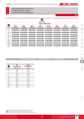 www.hifi-filter.comCARTOUCHES POUR LIQUIDESCARTRIDGES FOR LIQUIDSELEMENTEN F%u00dcR FL%u00dcSSIGKEITFRENDELIQ 1501-004EG383COURBES DE PERTE DE CHARGE I PRESSURE DROP CURVES I DRUCKABFALLKURVENAutres dimensions, embouts et seuils de filtration sur demande.Other sizes, end caps and filtration thresholds on request.Andere Abmessungen, Endst%u00fccke und Filtrierschwellen auf Anfrage66 / 27 MMHauteur / Height / H%u00f6he9\248 mm10\254 mm19\495 mm20\508 mm29\743 mm30\762 mm39\991 mm40\1016 mm1 EG 23101 MG1 EG 25101 MG1 EG 49101 MG2 EG 51101 MG2 EG 74101 MG3 EG 76101 MG3 EG 98101 MG4 EG 99101 MG43 EG 23103 MG1 EG 25103 MG1 EG 49103 MG2 EG 51103 MG2 EG 74103 MG3 EG 76103 MG3 EG 98103 MG4 EG 99103 MG45 EG 23105 MG1 EG 25105 MG1 EG 49105 MG2 EG 51105 MG2 EG 74105 MG3 EG 76105 MG3 EG 98105 MG4 EG 99105 MG410 EG 23110 MG1 EG 25110 MG1 EG 49110 MG2 EG 51110 MG2 EG 74110 MG3 EG 76110 MG3 EG 98110 MG4 EG 99110 MG425 EG 23125 MG1 EG 25125 MG1 EG 49125 MG2 EG 51125 MG2 EG 74125 MG3 EG 76125 MG3 EG 98125 MG4 EG 99125 MG450 EG 23150 MG1 EG 25150 MG1 EG 49150 MG2 EG 51150 MG2 EG 74150 MG3 EG 76150 MG3 EG 98150 MG4 EG 99150 MG475 EG 23175 MG1 EG 25175 MG1 EG 49175 MG2 EG 51175 MG2 EG 74175 MG3 EG 76175 MG3 EG 98175 MG4 EG 99175 MG4100 EG 23111 MG1 EG 25111 MG1 EG 49111 MG2 EG 51111 MG2 EG 74111 MG3 EG 76111 MG3 EG 98111 MG4 EG 99111 MG4125 EG 23113 MG1 EG 25113 MG1 EG 49113 MG2 EG 51113 MG2 EG 74113 MG3 EG 76113 MG3 EG 98113 MG4 EG 99113 MG4150 EG 23114 MG1 EG 25114 MG1 EG 49114 MG2 EG 51114 MG2 EG 74114 MG3 EG 76114 MG3 EG 98114 MG4 EG 99114 MG4%u2206P(Cartridge : 10\mbar - L/minQ max(Cartridge : 10\L/min1 5.93 18.93 3.71 18.95 2.32 18.910 1.30 18.925 0.65 22.750 0.41 22.775 0.26 22.7100 0.17 30.3125 0.07 30.3150 0.06 30.3www.madedistribuzionesrl.com