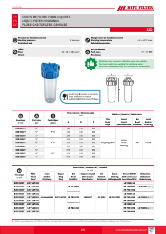 www.hifi-filter.comCORPS DE FILTRE POUR LIQUIDES LIQUID FILTER HOUSINGSFL%u00dcSSIGKEITSFILTER-GEH%u00c4USEFRENDELIQ 1502-001EZD390Temp%u00e9rature de fonctionnement Working temperatureBetriebstemperatur+4 %u2192 +45%u00b0C max.D%u00e9bitFlowStrom15 %u2192 35 %u2192 50 L/min1Pression de fonctionnementWorking pressureBetriebsdruck8 bar max.Mat%u00e9riaux non toxiques, utilisable pour eau potableNon-toxic materials, suitable for drinking waterNicht toxische Materialien, f%u00fcr Trinkwasser verwendbarHousingsN%u00b0 HifiPort sizeBSPCartridges(DOE)Dimensions / Abmessungenmm Mati%u00e8re / Material / MaterialenA B CT%u00eateHeadKopfInsertInsertGewindebuchseBolBowlBeh%u00e4lterJointGasketDichtungEZD 03227 %u00bd\4\191 133 130PolypropyleneLaitonBrassMessingPET EPDMEZD 03237 %u00be\191 133 130EZD 03247 1\197 145 130EZD 09227 %u00bd\9\315 133 130EZD 09237 %u00be\315 133 130EZD 09247 1\321 145 130EZD 20227 %u00bd\20\571 133 130EZD 20237 %u00be\571 133 130EZD 20247 1\577 145 130HousingsN%u00b0 HifiAccessoires / Accessories / Zubeh%u00f6rN%u00b0 HifiT%u00eateHeadKopfJointGasketDichtungBagueRingRingBolBowlBeh%u00e4lterSupport muralWall mountWandhalterCl%u00e9WrenchSchl%u00fcssel%u00c9ventVentingL%u00fcftungsventilRaccord M/MM/M connectorAnschluss M/MR%u00e9ductionReductionReduzierungEZD 03227 LB 711P321JR 091440533 E LB 7130730LB 71204017400007 CL 5001 LB 7407001LB 9020612EZD 03237 LB 7111301 RB 7404001 LB 9020611 (%u00bc\EZD 03247 LB 711P701 RB 7404002EZD 09227 LB 711P321LB 7120701LB 9020612EZD 09237 LB 7111301 RB 7404001 LB 9020611 (%u00bc\EZD 09247 LB 711P701 RB 7404002EZD 20227 LB 711P321LB 7121011LB 9020612EZD 20237 LB 7111301 RB 7404001 LB 9020611 (%u00bc\EZD 20247 LB 711P701 RB 7404002AB CRaccordementPort sizesAnschluss%u00bd\1. D%u00e9bit moyen d%u00e9pendant de l'%u00e9l%u00e9ment filtrant / Average flow rate depending on the filter element / Durchschnittsfluss, abh%u00e4ngig vom Filtrierelementwww.madedistribuzionesrl.com