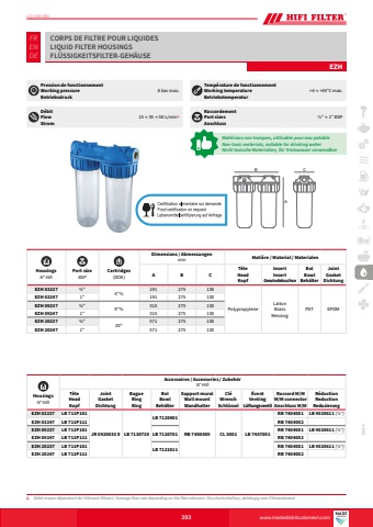 www.hifi-filter.comCORPS DE FILTRE POUR LIQUIDES LIQUID FILTER HOUSINGSFL%u00dcSSIGKEITSFILTER-GEH%u00c4USEFRENDELIQ 1502-004EZH393HousingsN%u00b0 HifiPort sizeBSPCartridges(DOE)Dimensions / Abmessungenmm Mati%u00e8re / Material / MaterialenA B CT%u00eateHeadKopfInsertInsertGewindebuchseBolBowlBeh%u00e4lterJointGasketDichtungEZH 03237 %u00be\4\191 275 130PolypropyleneLaitonBrassMessingPET EPDMEZH 03247 1\191 275 130EZH 09237 %u00be\9\315 275 130EZH 09247 1\315 275 130EZH 20237 %u00be\20\571 275 130EZH 20247 1\571 275 130Mat%u00e9riaux non toxiques, utilisable pour eau potableNon-toxic materials, suitable for drinking waterNicht toxische Materialien, f%u00fcr Trinkwasser verwendbarB CAHousingsN%u00b0 HifiAccessoires / Accessories / Zubeh%u00f6rN%u00b0 HifiT%u00eateHeadKopfJointGasketDichtungBagueRingRingBolBowlBeh%u00e4lterSupport muralWall mountWandhalterCl%u00e9WrenchSchl%u00fcssel%u00c9ventVentingL%u00fcftungsventilRaccord M/MM/M connectorAnschluss M/MR%u00e9ductionReductionReduzierungEZH 03237 LB 711P101JR 0920053 E LB 7130730LB 7120401RB 7400009 CL 5001 LB 7407001RB 7404001 LB 9020611 (%u00bc\EZH 03247 LB 711P111 RB 7404002EZH 09237 LB 711P101LB 7120701RB 7404001 LB 9020611 (%u00bc\EZH 09247 LB 711P111 RB 7404002EZH 20237 LB 711P101LB 7121011RB 7404001 LB 9020611 (%u00bc\EZH 20247 LB 711P111 RB 7404002Temp%u00e9rature de fonctionnement Working temperatureBetriebstemperatur+4 %u2192 +45%u00b0C max.D%u00e9bitFlowStrom15 %u2192 35 %u2192 50 L/min1Pression de fonctionnementWorking pressureBetriebsdruck8 bar max.RaccordementPort sizesAnschluss%u00bd\1. D%u00e9bit moyen d%u00e9pendant de l'%u00e9l%u00e9ment filtrant / Average flow rate depending on the filter element / Durchschnittsfluss, abh%u00e4ngig vom Filtrierelementwww.madedistribuzionesrl.com