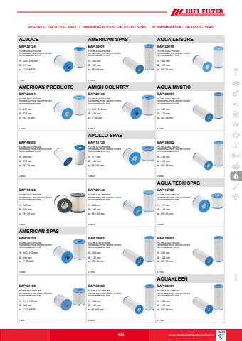 www.hifi-filter.comPISCINES - JACUZZIS - SPAS I SWIMMING POOLS - JACUZZIS - SPAS I SCHWIMMB%u00c4DER - JACUZZIS - SPAS423ALVOCE1,7M2EAP 20124FILTRE A EAU PISCINESWIMMING POOL WATER FILTERSCHWIMMBADFILTERH : 238 / 203 mm%u00d8 : 117 mm%u00f8 : 1\AMERICAN SPAS4,17M2EAP 34001FILTRE A EAU PISCINESWIMMING POOL WATER FILTERSCHWIMMBADFILTERH : 336 mm%u00d8 : 125 mm%u00f8 : 55 / 55 mmAQUA LEISUREEAP 20010FILTRE A EAU PISCINESWIMMING POOL WATER FILTERSCHWIMMBADFILTERH : 202 mm%u00d8 : 107 mm%u00f8 : 50 / 50 mmAMERICAN PRODUCTS2,27M2EAP 24801FILTRE A EAU PISCINESWIMMING POOL WATER FILTERSCHWIMMBADFILTERH : 249 mm%u00d8 : 178 mm%u00f8 : 76 / 76 mmAMISH COUNTRY3,64M2EAP 24100FILTRE A EAU PISCINESWIMMING POOL WATER FILTERSCHWIMMBADFILTERH : 242 / 210 mm%u00d8 : 148 mm%u00f8 : 1\AQUA MYSTIC4,17M2EAP 34001FILTRE A EAU PISCINESWIMMING POOL WATER FILTERSCHWIMMBADFILTERH : 336 mm%u00d8 : 125 mm%u00f8 : 55 / 55 mm4,80M2EAP 49800FILTRE A EAU PISCINESWIMMING POOL WATER FILTERSCHWIMMBADFILTERH : 498 mm%u00d8 : 178 mm%u00f8 : 76 / 76 mmAPOLLO SPAS1,06M2EAP 12720FILTRE A EAU PISCINESWIMMING POOL WATER FILTERSCHWIMMBADFILTERH : 117 mm%u00d8 : 126 mm%u00f8 : 55 / 55 mm2,03M2EAP 34002FILTRE A EAU PISCINESWIMMING POOL WATER FILTERSCHWIMMBADFILTERH : 336 mm%u00d8 : 125 mm%u00f8 : 55 / 55 mm7,00M2EAP 74502FILTRE A EAU PISCINESWIMMING POOL WATER FILTERSCHWIMMBADFILTERH : 745 mm%u00d8 : 178 mm%u00f8 : 76 / 76 mm2,04M2EAP 26144FILTRE A EAU PISCINESWIMMING POOL WATER FILTERSCHWIMMBADFILTERH : 266 mm%u00d8 : 145 mm%u00f8 : 55 / 3.5 mmAQUA TECH SPAS1,06M2EAP 12720FILTRE A EAU PISCINESWIMMING POOL WATER FILTERSCHWIMMBADFILTERH : 117 mm%u00d8 : 126 mm%u00f8 : 55 / 55 mmAMERICAN SPAS3,64M2EAP 24100FILTRE A EAU PISCINESWIMMING POOL WATER FILTERSCHWIMMBADFILTERH : 242 / 210 mm%u00d8 : 148 mm%u00f8 : 1\4,17M2EAP 34001FILTRE A EAU PISCINESWIMMING POOL WATER FILTERSCHWIMMBADFILTERH : 336 mm%u00d8 : 125 mm%u00f8 : 55 / 55 mm4,17M2EAP 34001FILTRE A EAU PISCINESWIMMING POOL WATER FILTERSCHWIMMBADFILTERH : 336 mm%u00d8 : 125 mm%u00f8 : 55 / 55 mm2,2M2EAP 24150FILTRE A EAU PISCINESWIMMING POOL WATER FILTERSCHWIMMBADFILTERH : 211 / 178 mm%u00d8 : 148 mm%u00f8 : 1\2,03M2EAP 34002FILTRE A EAU PISCINESWIMMING POOL WATER FILTERSCHWIMMBADFILTERH : 336 mm%u00d8 : 125 mm%u00f8 : 55 / 55 mmAQUAKLEEN4,17M2EAP 34001FILTRE A EAU PISCINESWIMMING POOL WATER FILTERSCHWIMMBADFILTERH : 336 mm%u00d8 : 125 mm%u00f8 : 55 / 55 mmwww.madedistribuzionesrl.com