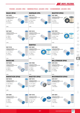 www.hifi-filter.comPISCINES - JACUZZIS - SPAS I SWIMMING POOLS - JACUZZIS - SPAS I SCHWIMMB%u00c4DER - JACUZZIS - SPAS437MAAX SPAS6,25M2EAP 32200FILTRE A EAU PISCINESWIMMING POOL WATER FILTERSCHWIMMBADFILTERH : 358 / 330 mm%u00d8 : 201 mm%u00f8 : 54 / 46 mmMARQUIS SPA4,18M2EAP 31013FILTRE A EAU PISCINESWIMMING POOL WATER FILTERSCHWIMMBADFILTERH : 351 / 318 mm%u00d8 : 130 mm%u00f8 : 58,7-12GMASTER SPASEAP 18098FILTRE A EAU PISCINESWIMMING POOL WATER FILTERSCHWIMMBADFILTERH : 178 mm%u00d8 : 97.5 mm%u00f8 : 55.5 / 55.5 mm4,17M2EAP 34001FILTRE A EAU PISCINESWIMMING POOL WATER FILTERSCHWIMMBADFILTERH : 336 mm%u00d8 : 125 mm%u00f8 : 55 / 55 mmEAP 32132FILTRE A EAU PISCINESWIMMING POOL WATER FILTERSCHWIMMBADFILTERH : 351 / 320 mm%u00d8 : 131 mm%u00f8 : 2\3,47M2EAP 18700FILTRE A EAU PISCINESWIMMING POOL WATER FILTERSCHWIMMBADFILTERH : 188 / 172 mm%u00d8 : 203 mm%u00f8 : 102 / 102 mm5,70M2EAP 37135FILTRE A EAU PISCINESWIMMING POOL WATER FILTERSCHWIMMBADFILTERH : 377 / 375 mm%u00d8 : 135 mm%u00f8 : 55 / 55 mmMARTEC2,60M2EAP 30001FILTRE A EAU PISCINESWIMMING POOL WATER FILTERSCHWIMMBADFILTERH : 302 / 300 mm%u00d8 : 126 mm%u00f8 : 55 / 55 mm3,64M2EAP 24100FILTRE A EAU PISCINESWIMMING POOL WATER FILTERSCHWIMMBADFILTERH : 242 / 210 mm%u00d8 : 148 mm%u00f8 : 1\MAGILINE6,45M2EAP 60300FILTRE A EAU PISCINESWIMMING POOL WATER FILTERSCHWIMMBADFILTERH : 602 mm%u00d8 : 295 mm%u00f8 : 251 / 251 mm2,30M2EAP 37800FILTRE A EAU PISCINESWIMMING POOL WATER FILTERSCHWIMMBADFILTERH : 378 mm%u00d8 : 126 mm%u00f8 : 55 / 55 mmMILLENNIUM SPAS3,64M2EAP 24100FILTRE A EAU PISCINESWIMMING POOL WATER FILTERSCHWIMMBADFILTERH : 242 / 210 mm%u00d8 : 148 mm%u00f8 : 1\MARATHON SPAS3,18M2EAP 30120FILTRE A EAU PISCINESWIMMING POOL WATER FILTERSCHWIMMBADFILTERH : 337 / 302 mm%u00d8 : 118 mm%u00f8 : 11G5/8\MASTER SPASEAP 10110FILTRE A EAU PISCINESWIMMING POOL WATER FILTERSCHWIMMBADFILTERH : 127 / 105 mm%u00d8 : 111 / 109 mm%u00f8 : 67 / 49 mmMOONWATER SPAS2,61M2EAP 23127FILTRE A EAU PISCINESWIMMING POOL WATER FILTERSCHWIMMBADFILTERH : 235 mm%u00d8 : 125 mm%u00f8 : 56 / 56 mm4,17M2EAP 34001FILTRE A EAU PISCINESWIMMING POOL WATER FILTERSCHWIMMBADFILTERH : 336 mm%u00d8 : 125 mm%u00f8 : 55 / 55 mmEAP 12140FILTRE A EAU PISCINESWIMMING POOL WATER FILTERSCHWIMMBADFILTERH : 121 / 117 mm%u00d8 : 139.5 mm%u00f8 : 56 mm4,17M2EAP 34001FILTRE A EAU PISCINESWIMMING POOL WATER FILTERSCHWIMMBADFILTERH : 336 mm%u00d8 : 125 mm%u00f8 : 55 / 55 mmwww.madedistribuzionesrl.com