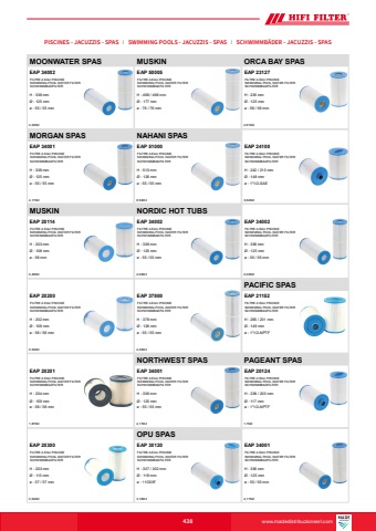 www.hifi-filter.comPISCINES - JACUZZIS - SPAS I SWIMMING POOLS - JACUZZIS - SPAS I SCHWIMMB%u00c4DER - JACUZZIS - SPAS438MOONWATER SPAS2,03M2EAP 34002FILTRE A EAU PISCINESWIMMING POOL WATER FILTERSCHWIMMBADFILTERH : 336 mm%u00d8 : 125 mm%u00f8 : 55 / 55 mmMUSKINEAP 50005FILTRE A EAU PISCINESWIMMING POOL WATER FILTERSCHWIMMBADFILTERH : 498 / 496 mm%u00d8 : 177 mm%u00f8 : 76 / 76 mmORCA BAY SPAS2,61M2EAP 23127FILTRE A EAU PISCINESWIMMING POOL WATER FILTERSCHWIMMBADFILTERH : 235 mm%u00d8 : 125 mm%u00f8 : 56 / 56 mmMORGAN SPAS4,17M2EAP 34001FILTRE A EAU PISCINESWIMMING POOL WATER FILTERSCHWIMMBADFILTERH : 336 mm%u00d8 : 125 mm%u00f8 : 55 / 55 mmNAHANI SPAS6,52M2EAP 51000FILTRE A EAU PISCINESWIMMING POOL WATER FILTERSCHWIMMBADFILTERH : 510 mm%u00d8 : 126 mm%u00f8 : 55 / 55 mm3,64M2EAP 24100FILTRE A EAU PISCINESWIMMING POOL WATER FILTERSCHWIMMBADFILTERH : 242 / 210 mm%u00d8 : 148 mm%u00f8 : 1\MUSKIN0,46M2EAP 20114FILTRE A EAU PISCINESWIMMING POOL WATER FILTERSCHWIMMBADFILTERH : 203 mm%u00d8 : 108 mm%u00f8 : 56 mmNORDIC HOT TUBS2,03M2EAP 34002FILTRE A EAU PISCINESWIMMING POOL WATER FILTERSCHWIMMBADFILTERH : 336 mm%u00d8 : 125 mm%u00f8 : 55 / 55 mm2,03M2EAP 34002FILTRE A EAU PISCINESWIMMING POOL WATER FILTERSCHWIMMBADFILTERH : 336 mm%u00d8 : 125 mm%u00f8 : 55 / 55 mm0,54M2EAP 20200FILTRE A EAU PISCINESWIMMING POOL WATER FILTERSCHWIMMBADFILTERH : 202 mm%u00d8 : 109 mm%u00f8 : 56 / 56 mm2,30M2EAP 37800FILTRE A EAU PISCINESWIMMING POOL WATER FILTERSCHWIMMBADFILTERH : 378 mm%u00d8 : 126 mm%u00f8 : 55 / 55 mmPACIFIC SPASEAP 21152FILTRE A EAU PISCINESWIMMING POOL WATER FILTERSCHWIMMBADFILTERH : 265 / 231 mm%u00d8 : 149 mm%u00f8 : 1\1,87M2EAP 20201FILTRE A EAU PISCINESWIMMING POOL WATER FILTERSCHWIMMBADFILTERH : 204 mm%u00d8 : 159 mm%u00f8 : 58 / 58 mmNORTHWEST SPAS4,17M2EAP 34001FILTRE A EAU PISCINESWIMMING POOL WATER FILTERSCHWIMMBADFILTERH : 336 mm%u00d8 : 125 mm%u00f8 : 55 / 55 mmPAGEANT SPAS1,7M2EAP 20124FILTRE A EAU PISCINESWIMMING POOL WATER FILTERSCHWIMMBADFILTERH : 238 / 203 mm%u00d8 : 117 mm%u00f8 : 1\0,54M2EAP 20300FILTRE A EAU PISCINESWIMMING POOL WATER FILTERSCHWIMMBADFILTERH : 203 mm%u00d8 : 113 mm%u00f8 : 57 / 57 mmOPU SPAS3,18M2EAP 30120FILTRE A EAU PISCINESWIMMING POOL WATER FILTERSCHWIMMBADFILTERH : 337 / 302 mm%u00d8 : 118 mm%u00f8 : 11G5/8\4,17M2EAP 34001FILTRE A EAU PISCINESWIMMING POOL WATER FILTERSCHWIMMBADFILTERH : 336 mm%u00d8 : 125 mm%u00f8 : 55 / 55 mmwww.madedistribuzionesrl.com