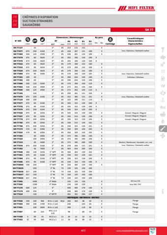 www.hifi-filter.comCR%u00c9PINES D%u2019ASPIRATION SUCTION STRAINERSSAUGK%u00d6RBEFRENDEHYD 1104-001SH 77477N%u00b0 Hifil/mn cm%u00b2Dimensions / Abmessungen By-passCartridgeCaract%u00e9ristiquesCharacteristicsEigenschaftenD7 H1mmH2mmD1mmD2mm Yes NoBSP mmSH 77127 25 3\ 85 223 216 152 XSH 77077 875 250 4160 3\ 85 228 207 131 100 X Inox / Stainless / Edelstahl rostfreiSH 77469 500 125 2500 3\ 85 236 201 134 100 XSH 77574 875 60 3620 3\ 85 292 250 130 100 XSH 77576 875 250 3620 3\ 85 292 250 130 100 XSH 77522 875 60 3620 3\ 85 279 250 132 100 XSH 77523 875 90 3620 3\ 85 279 250 132 100 XSH 77524 875 250 3620 3\ 85 279 250 132 100 XSH 77084 875 90 4200 3\ 85 270 250 150 105 X Inox / Stainless / Edelstahl rostfreiSH 77351 400 30 3\ 85 290 264 150 100 X Cellulose / ZelluloseSH 77352 400 60 3\ 85 290 264 150 100 XSH 77006 500 125 5240 3\ 85 270 250 150 110 XSH 77053 550 250 3900 3\ 85 272 252 150 100 XSH 77035 500 125 2500 3\ 85 272 262 150 110 XSH 77193 - 150 - 3\ 85 299 281 131 104 XSH 77079 875 250 4160 3\ 85 322 305 131 101 X Inox / Stainless / Edelstahl rostfreiSH 77119 600 100 3\ 85 325 290 151 110 XSH 77577 875 60 4160 3\ 85 345 315 130 100 XSH 77578 875 90 4160 3\ 85 345 315 130 100 XSH 77579 875 250 4160 3\ 85 345 315 130 100 XSH 77526 875 60 4250 3\ 85 345 315 130 106 X Aimant / Magnet / MagnetSH 77527 875 90 4250 3\ 85 345 315 130 106 X Aimant / Magnet / MagnetSH 77774 875 250 4250 3\ 85 345 315 130 106 X Aimant / Magnet / MagnetSH 77702 875 60 4250 3\ 85 330 315 130 101 XSH 77700 875 250 4250 3\ 85 330 315 130 101 XSH 77173 570 60 6300 3\ 85 350 329 150 105 XSH 77015 570 90 6300 3\ 85 350 329 150 105 XSH 77303 40 4400 3\ 85 375 345 200 100 XSH 77319 100 4400 3\ 85 375 345 200 100 XSH 77313 40 4400 3\ 85 375 345 200 100 X Renfort / Reinforced / Verst%u00e4rkt : int + extSH 77078 875 250 4160 3\ 85 378 355 131 101 X Inox / Stainless / Edelstahl rostfreiSH 77302 40 7000 3\ 85 483 454 200 100 XSH 77640 380 140 3230 3\ 85 300 263 130 102 XSH 77491 875 60 4160 3\ 85 330 315 130 101 XSH 77484 875 90 4160 3\ 85 330 315 130 100 XSH 77645 875 90 4160 3\85 330 310 130 100 XSH 776009 540 250 3\ 85 330 305 130 100 XSH 776639 250 3\ 74 150 125 150 100SH 776638 817 100 3\ 74 150 125 150 100SH 776637 817 150 3\ 74 150 125 150 100SH 776636 817 250 3\ 74 150 125 150 100SH 77841 - 1600 - 4\ - 145 125 130 - X All Inox 316SH 77845 - 1200 - 4\ - 150 130 130 - X Inox 304 / PVCSH 77170 600 125 - 4\ - 440 405 178 140 XSH 77174 600 250 - 4\ - 440 405 178 140 XSH 77614 - 140 - 4\ - 381 341 206 127 XMETRIQUE - METRISCH - METRICSH 77626 250 100 950 M 6 x 1 (x4) 49,6 182 163 86 50 X FlangeSH 77652 400 100 1700 M 6 x 1 (x4) 228 - 105 65 X FlangeSH 77651 100 2000 M 6 x 1 (x4) 280 - 118 80 X FlangeSH 77057 60 210 M 6 x 1.5 (x3) 98 - 80 33 X FlangeSH 77430 5 90 34 M 12 x 1 11 29 21 32 22 XSH 77432 10 90 100 M 12 x 1 11 34 26 80 22 Xwww.madedistribuzionesrl.com