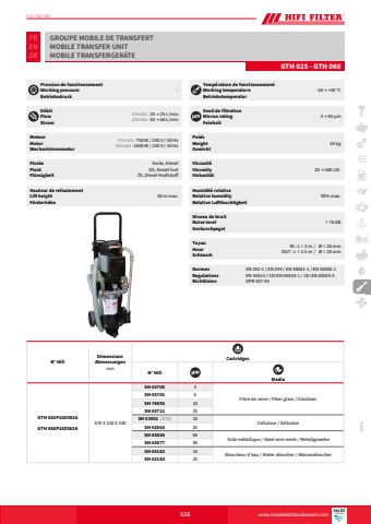 www.hifi-filter.comGROUPE MOBILE DE TRANSFERTMOBILE TRANSFER UNITMOBILE TRANSFERGER%u00c4TEFRENDEHYD 1307-003GTH 025 - GTH 060525Pression de fonctionnement Working pressureBetriebsdruck-Temp%u00e9rature de fonctionnementWorking temperatureBetriebstemperatur-10 %u2192 +40 %u00b0CSeuil de filtrationMicron ratingFeinheit3 %u2192 90 %u00b5mD%u00e9bitFlowStromGTH 025 : 20 %u2192 25 L/minGTH 060 : 50 %u2192 60 L/minMoteurMotorWechselstrommotorGTH 025 : 750 W / 230 V / 50 HzGTH 060 : 1600 W / 230 V / 50 Hz PoidsWeightGewicht26 kgViscosit%u00e9ViscosityViskosit%u00e4t20 %u2192 500 cSt.Niveau de bruitNoise levelGer%u00e4uschpegel< 70 dBHumidit%u00e9 relativeRelative humidityRelative Luftfeuchtigkeit90% max.N%u00b0 HifiDimensionsAbmessungenmmCartridgesN%u00b0 HifiMediaGTH 025P10Z003AGTH 060P10Z003A670 X 310 X 330SH 63700 3Fibre de verre / Fiber glass / GlasfaserSH 63701 6SH 76855 10SH 63711 25SH 63061 (STD) 10Cellulose / Zellulose SH 63063 25SH 63066 60Toile m%u00e9tallique / Steel wire mesh / Metallgewebe SH 63077 90SH 63182 10Absorbeur d'eau / Water absorber / Wasserabsorber SH 63183 25FluideFluidFl%u00fcssigkeitHuile, DieselOil, Diesel fuel%u00d6l, Diesel-KraftstoffHauteur de refoulementLift heightF%u00f6rderh%u00f6he30 m max.TuyauHoseSchlauchIN : L = 2 m / %u00d8 = 20 mmOUT : L = 2.5 m / %u00d8 = 20 mmNormes Regulations Richtlinien EN 292-2 / EN 294 / EN 50081-1 / EN 50082-1EN 55014 / CEI EN 60034-1 / CEI EN 60034-5DPR 547-55www.madedistribuzionesrl.com