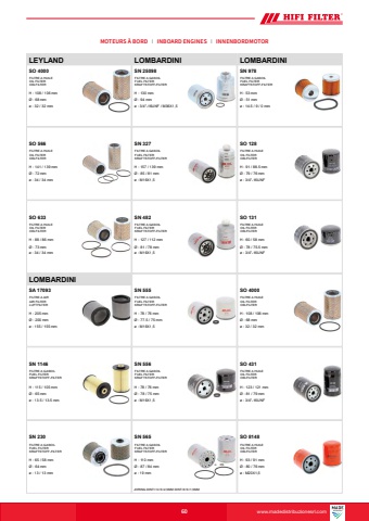 www.hifi-filter.comMOTEURS %u00c0 BORD I INBOARD ENGINES I INNENBORDMOTOR60LEYLANDSO 4000FILTRE A HUILEOIL FILTEROELFILTERH : 108 / 106 mm%u00d8 : 68 mm%u00f8 : 32 / 32 mmLOMBARDINISN 25098FILTRE A GASOILFUEL FILTERKRAFTSTOFF-FILTERH : 130 mm%u00d8 : 94 mm%u00f8 : 3/4\LOMBARDINISN 978FILTRE A GASOILFUEL FILTERKRAFTSTOFF-FILTERH : 53 mm%u00d8 : 51 mm%u00f8 : 14.5 / 9 / 0 mmSO 566FILTRE A HUILEOIL FILTEROELFILTERH : 141 / 139 mm%u00d8 : 72 mm%u00f8 : 34 / 34 mmSN 327FILTRE A GASOILFUEL FILTERKRAFTSTOFF-FILTERH : 157 / 139 mm%u00d8 : 85 / 81 mm%u00f8 : M16X1,5SO 128FILTRE A HUILEOIL FILTEROELFILTERH : 91 / 88.5 mm%u00d8 : 79 / 76 mm%u00f8 : 3/4\SO 633FILTRE A HUILEOIL FILTEROELFILTERH : 88 / 86 mm%u00d8 : 73 mm%u00f8 : 34 / 34 mmSN 482FILTRE A GASOILFUEL FILTERKRAFTSTOFF-FILTERH : 127 / 112 mm%u00d8 : 81 / 78 mm%u00f8 : M16X1,5SO 131FILTRE A HUILEOIL FILTEROELFILTERH : 60 / 58 mm%u00d8 : 78 / 75.5 mm%u00f8 : 3/4\LOMBARDINISA 17093FILTRE A AIRAIR FILTERLUFTFILTERH : 205 mm%u00d8 : 200 mm%u00f8 : 155 / 155 mmSN 555FILTRE A GASOILFUEL FILTERKRAFTSTOFF-FILTERH : 78 / 76 mm%u00d8 : 77.5 / 75 mm%u00f8 : M16X1,5SO 4000FILTRE A HUILEOIL FILTEROELFILTERH : 108 / 106 mm%u00d8 : 68 mm%u00f8 : 32 / 32 mmSN 1146FILTRE A GASOILFUEL FILTERKRAFTSTOFF-FILTERH : 115 / 105 mm%u00d8 : 65 mm%u00f8 : 13.5 / 13.5 mmSN 556FILTRE A GASOILFUEL FILTERKRAFTSTOFF-FILTERH : 78 / 76 mm%u00d8 : 78 / 75 mm%u00f8 : M16X1,5SO 431FILTRE A HUILEOIL FILTEROELFILTERH : 123 / 121 mm%u00d8 : 81 / 79 mm%u00f8 : 3/4\SN 230FILTRE A GASOILFUEL FILTERKRAFTSTOFF-FILTERH : 65 / 58 mm%u00d8 : 64 mm%u00f8 : 13 / 13 mmJORING DINT=14 S=2,5MM DINT=6 S=1,5MMSN 565FILTRE A GASOILFUEL FILTERKRAFTSTOFF-FILTERH : 110 mm%u00d8 : 87 / 84 mm%u00f8 : 19 mmSO 8148FILTRE A HUILEOIL FILTEROELFILTERH : 93 / 91 mm%u00d8 : 80 / 76 mm%u00f8 : M20X1,5www.madedistribuzionesrl.com