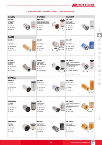 www.hifi-filter.comMOTEURS %u00c0 BORD I INBOARD ENGINES I INNENBORDMOTOR83SABRESO 3315FILTRE A HUILEOIL FILTEROELFILTERH : 137 / 133 mm%u00d8 : 98 / 95 mm%u00f8 : M22X1,5SCANIASAO 6202FILTRE AERATION MOTEURENGINE BREATHER FILTERMOTORENTL%u00dcFTUNG FILTERH : 151 / 125 mm%u00d8 : 97 mm%u00f8 : 23 mmSCANIASN 5167FILTRE A GASOILFUEL FILTERKRAFTSTOFF-FILTERH : 122 / 120 mm%u00d8 : 78 / 77 mm%u00f8 : M16X1,5SACMSN 99131FILTRE A GASOILFUEL FILTERKRAFTSTOFF-FILTERH : 299 / 296 mm%u00d8 : 105 mm%u00f8 : 32.5 / 32.5 mmSN 001FILTRE A GASOILFUEL FILTERKRAFTSTOFF-FILTERH : 72 mm%u00d8 : 87 / 84 mm%u00f8 : 19 mmSN 5297FILTRE A GASOILFUEL FILTERKRAFTSTOFF-FILTERH : 143 / 141 mm%u00d8 : 97 / 94 mm%u00f8 : M24X1,5SO 9002FILTRE A HUILEOIL FILTEROELFILTERH : 299 / 294 mm%u00d8 : 145 mm%u00f8 : 57 / 57 mmSN 090FILTRE A GASOILFUEL FILTERKRAFTSTOFF-FILTERH : 115 / 105 mm%u00d8 : 59 mm%u00f8 : 13.5 / 13.5 mm30%u00b5_BOL/GLASS BOWL: MO 3916SN 909030FILTRE A GASOIL SEPARATEURD'EAUFUEL WATER SEPARATOR FILTERABSCHEIDER DIESELFILTERH : 158 / 143.5 mm%u00d8 : 111 / 108 mm%u00f8 : 1\SCANIASA 16105FILTRE A AIRAIR FILTERLUFTFILTERH : 528 / 515 mm%u00d8 : 302 mm%u00f8 : 171 mmSN 30005FILTRE A GASOILFUEL FILTERKRAFTSTOFF-FILTERH : 142 / 140 mm%u00d8 : 95 / 93 mm%u00f8 : M24X1,5SN 920230FILTRE A GASOILFUEL FILTERKRAFTSTOFF-FILTERH : 246 mm%u00d8 : 111 mm%u00f8 : 20 / 17 mmSAB 085056FILTRE A AIRAIR FILTERLUFTFILTERH : 300 / 260 mm%u00d8 : 195 mm%u00f8 : 151 mmSN 327FILTRE A GASOILFUEL FILTERKRAFTSTOFF-FILTERH : 157 / 139 mm%u00d8 : 85 / 81 mm%u00f8 : M16X1,5SN 920410FILTRE A GASOIL SEPARATEURD'EAUFUEL WATER SEPARATOR FILTERABSCHEIDER DIESELFILTERH : 118 mm%u00d8 : 111 mm%u00f8 : 20 / 17 mmSAB 125011FILTRE A AIRAIR FILTERLUFTFILTERH : 260 / 227 mm%u00d8 : 317 mm%u00f8 : 127 mmSN 5074FILTRE A GASOILFUEL FILTERKRAFTSTOFF-FILTERH : 123 / 120 mm%u00d8 : 78 / 76 mm%u00f8 : M16X1,5SN 920430FILTRE A GASOILFUEL FILTERKRAFTSTOFF-FILTERH : 118 mm%u00d8 : 111 mm%u00f8 : 20 / 17 mmwww.madedistribuzionesrl.com