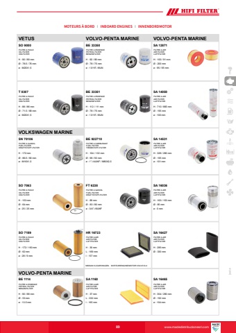 www.hifi-filter.comMOTEURS %u00c0 BORD I INBOARD ENGINES I INNENBORDMOTOR89VETUSSO 9000FILTRE A HUILEOIL FILTEROELFILTERH : 90 / 89 mm%u00d8 : 78.5 / 76 mm%u00f8 : M20X1,5VOLVO-PENTA MARINEBE 33350FILTRE A ESSENCEPETROL FILTERBENZINFILTERH : 92 / 89 mm%u00d8 : 78 / 75 mm%u00f8 : 13/16\VOLVO-PENTA MARINESA 12871FILTRE A AIRAIR FILTERLUFTFILTERH : 100 / 91 mm%u00d8 : 200 mm%u00f8 : 95 / 95 mmT 8307FILTRE A HUILEOIL FILTEROELFILTERH : 88 / 86 mm%u00d8 : 71.5 / 68 mm%u00f8 : M20X1,5BE 33351FILTRE A ESSENCEPETROL FILTERBENZINFILTERH : 112 / 111 mm%u00d8 : 78 / 75 mm%u00f8 : 13/16\SA 14050FILTRE A AIRAIR FILTERLUFTFILTERH : 710 / 665 mm%u00d8 : 195 mm%u00f8 : 100 mmVOLKSWAGEN MARINESN 70106FILTRE A GASOILFUEL FILTERKRAFTSTOFF-FILTERH : 172 mm%u00d8 : 86.5 / 80 mm%u00f8 : M16X1,5BE 922710FILTRE A CARBURANTFUEL FILTERTREIBSTOFF-FILTERH : 104 / 102 mm%u00d8 : 96 / 93 mm%u00f8 : 1\SA 14531FILTRE A AIRAIR FILTERLUFTFILTERH : 326 / 280 mm%u00d8 : 195 mm%u00f8 : 101 mmSO 7063FILTRE A HUILEOIL FILTEROELFILTERH : 153 mm%u00d8 : 64 mm%u00f8 : 25 / 25 mmFT 6238FILTRE A GASOILFUEL FILTERKRAFTSTOFF-FILTERH : 89 mm%u00d8 : 83 / 80 mm%u00f8 : 3/4\SA 16036FILTRE A AIRAIR FILTERLUFTFILTERH : 163 / 153 mm%u00d8 : 85 mm%u00f8 : 0 mmSO 7189FILTRE A HUILEOIL FILTEROELFILTERH : 172 / 160 mm%u00d8 : 62 mm%u00f8 : 28 / 9 mmNISSAN VL/CAR/WAGEN. MOTEUR/ENGINE/MOTOR VOLVO D-3HR 16723FILTRE A AIRAIR FILTERLUFTFILTERH : 30 mmL : 169 mml : 157 mmSA 16427FILTRE A AIRAIR FILTERLUFTFILTERH : 285 mm%u00d8 : 330 mmVOLVO-PENTA MARINEBE 1114FILTRE A ESSENCEPETROL FILTERBENZINFILTERH : 90 / 88 mm%u00d8 : 53 mm%u00f8 : 10.5 mmSA 1160FILTRE A AIRAIR FILTERLUFTFILTERH : 37 mmL : 332 mml : 165 mmSA 16465FILTRE A AIRAIR FILTERLUFTFILTERH : 304 / 280 mm%u00d8 : 192 mm%u00f8 : 104 mmwww.madedistribuzionesrl.com