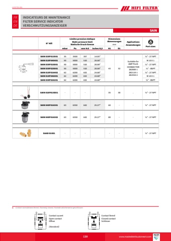 www.hifi-filter.comINDICATEURS DE MAINTENANCEFILTER SERVICE INDICATORVERSCHMUTZUNGSANZEIGERFRENDEAIR 0705-001SAIN1301. Contact normalement ferm%u00e9 / Normaly closed / Kontakt %u00fcblicherweise geschlossenN%u00b0 HifiLimites pression statique Static pressure limit Statische Druck-GrenzeDimensionsAbmessungenmm ApplicationsAnwendungen Port sizesmbar Pa mm H20 inches H20 H1 D1T%u00e9moin %u00e9lectrique avec borne AMP / Electrical indicator with AMP connector / Elektrischer Anzeiger mit AMP-KlemmeSAIN 03EF013501 35 3500 357 14.05\43 32Suitable for AMP PLUS CONNECTOR 282080-1 282110-1 281934-2%u215b\SAIN 01EF045401 50 5000 510 20.08\M 10 X 1SAIN 03EF015001 50 5000 510 20.08\%u215b\SAIN 03EF025001 50 5000 510 20.08\%u215b\SAIN 01EF016402 62 6200 632 24.88\%u215b\SAIN 01EF046401 62 6200 632 24.88\M 10 X 1SAIN 03EF026201 62 6200 632 24.88\%u215b\Electrique / Electrical / ElektrischSAIN 01EF01XX01 - - - 35 30 - %u215b\SAIN 04EF016301 63 6350 642 25.27\60 - - %u215b\SAIN 04EF016302 63 6350 642 25.27\80 - - %u215b\Accessoires / Accesories / Zuberh%u00f6rSAAD 01001 - - - - - - %u215b\Contact ouvertOpen contactOffner(Standard)Contact ferm%u00e9Closed contactSchlisserwww.madedistribuzionesrl.com