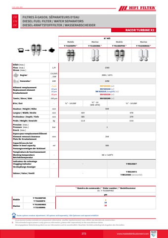www.hifi-filter.comFILTRES %u00c0 GASOIL S%u00c9PARATEURS D'EAUDIESEL FUEL FILTER / WATER SEPARATORSDIESEL-KRAFTSTOFFFILTER / WASSERABSCHEIDERFRENDECAR 1001-002RACOR TURBINE X2272N%u00b0 HifiMobile Marine Mobile MarineY 731000FH * Y 731000MA * Y 751000FHX * Y 751000MAX *D%u00e9bit (max.)Flow (max.)Strom (max.)L/H 1363Engine 1 CV (HP)/ kW 2001 / 1471Generator 1 kVA 1492El%u00e9ment remplacement Replacement elementErsatzelement2 %u00b5m10 %u00b5m10 %u00b5m30 %u00b5mSN 920202 (x2)SN 920210 (x2)SN 925210 (Longlife) (x2)SN 920230 (x2)Tamis / Sieve / Sieb 150 %u00b5m SN 920249 (x2)%u00d8 In / Out - %u215e\%u00be\ - 14(SAE J476) %u215e\ - 14 UNFHauteur / Height / H%u00f6he mm 559Largeur / Width / Breite mm 419 478Profondeur / Depth / Tiefe mm 305 279Poids / Weight / Gewicht kg 11.8 13.6Pression (max.)Pressure (max.)Druck (max.)bar 1Espace pour remplacement %u00e9l%u00e9mentElement removal clearancePlatz f%u00fcr Ersatzelementmm 254Capacit%u00e9 eau du bol Water in bowl capacityFassungsverm%u00f6gen der Sch%u00fcsselml 305Temp%u00e9rature de fonctionnement Working temperatureBetriebstemperatur - -40 %u2192 +124%u00baCIndicateur de colmatage Clogging indicatorVerstopfungs-Anzeiger- - Y RK19667Valnne / Valve / Ventil - Y RK19473Y RK19506 (service kit)* Num%u00e9ro de commande / * Order number / * BestellnummerEx : Y 751000FHX2%u00b5mMobile Y 751000FHXY 731000FH 210Marine 30 Y 751000MAXY 731000MAToutes options vendues s%u00e9par%u00e9ment / All options sold separately / Alle Optionen sind separat erh%u00e4ltlich1.La puissance moteur estim%u00e9e est uniquement informative, veuillez imp%u00e9rativement vous r%u00e9f%u00e9rer aux donn%u00e9es du constructeur.The estimated engine power is only given as information, please refer imperatively to the manufacturer datas.Die angegebene Motorleistung dient nur zur Information und ist unverbindlich. Beachten Sie bitte unbedingt die Angaben des Herstellers.www.madedistribuzionesrl.com