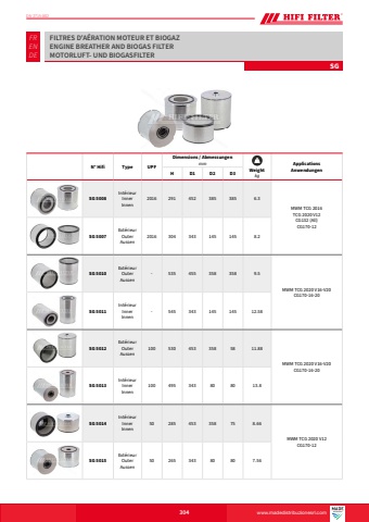 www.hifi-filter.comFILTRES D'A%u00c9RATION MOTEUR ET BIOGAZENGINE BREATHER AND BIOGAS FILTERMOTORLUFT- UND BIOGASFILTERFRENDEDIV 2715-002SG304N%u00b0 Hifi Type UPFDimensions / AbmessungenmmWeightkgApplicationsAnwendungen H D1 D2 D3SG 5008Int%u00e9rieur InnerInnen2016 291 452 385 385 6.3MWM TCG 2016TCG 2020 V12CG132 (All)CG170-12SG 5007Ext%u00e9rieurOuterAussen2016 304 343 145 145 8.2SG 5010Ext%u00e9rieurOuterAussen- 535 455 358 358 9.5MWM TCG 2020 V16-V20CG170-16-20SG 5011Int%u00e9rieur InnerInnen- 545 343 145 145 12.58SG 5012Ext%u00e9rieurOuterAussen100 530 453 358 58 11.88MWM TCG 2020 V16-V20CG170-16-20SG 5013Int%u00e9rieur InnerInnen100 495 343 80 80 13.8SG 5014Int%u00e9rieur InnerInnen50 285 453 358 75 8.66MWM TCG 2020 V12CG170-12SG 5015Ext%u00e9rieurOuterAussen50 265 343 80 80 7.56www.madedistribuzionesrl.com