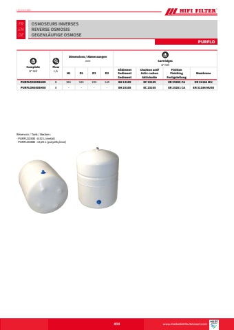 www.hifi-filter.comOSMOSEURS INVERSESREVERSE OSMOSISGEGENL%u00c4UFIGE OSMOSEFRENDELIQ 1513-001PURFLO404CompleteN%u00b0 HifiFlowL/hDimensions / Abmessungenmm CartridgesN%u00b0 HifiH1 D1 D2 D3S%u00e9dimentSedimentSedimentCharbon actif Activ carbon AktivkohleFinition Finishing FertigstellungMembranePURFLO2500SH50 8 265 345 195 140 EH 13105 EC 13105 ER 25205 CA ER 31184 MUPURFLO4000SH50 8 - - - - EH 25105 EC 23105 ER 25201 CA ER 31184 MU50R%u00e9servoir / Tank / Becken :- PURFLO2500 : 8.32 L (metal) - PURFLO4000 : 13,25 L (polyethylene)www.madedistribuzionesrl.com