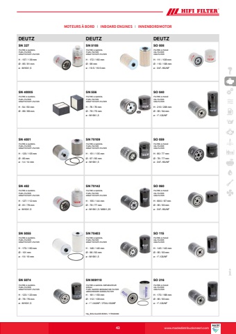 www.hifi-filter.comMOTEURS %u00c0 BORD I INBOARD ENGINES I INNENBORDMOTOR43DEUTZSN 327FILTRE A GASOILFUEL FILTERKRAFTSTOFF-FILTERH : 157 / 139 mm%u00d8 : 85 / 81 mm%u00f8 : M16X1,5DEUTZSN 5105FILTRE A GASOILFUEL FILTERKRAFTSTOFF-FILTERH : 172 / 160 mm%u00d8 : 98 mm%u00f8 : 19.5 / 19.5 mmDEUTZSO 008FILTRE A HUILEOIL FILTEROELFILTERH : 111 / 108 mm%u00d8 : 110 / 108 mm%u00f8 : 3/4\SN 40005FILTRE A GASOILFUEL FILTERKRAFTSTOFF-FILTERH : 54 / 50 mm%u00d8 : 89 / 89 mmSN 556FILTRE A GASOILFUEL FILTERKRAFTSTOFF-FILTERH : 78 / 76 mm%u00d8 : 78 / 75 mm%u00f8 : M16X1,5SO 040FILTRE A HUILEOIL FILTEROELFILTERH : 210 / 208 mm%u00d8 : 95 / 94 mm%u00f8 : 1\SN 4001FILTRE A GASOILFUEL FILTERKRAFTSTOFF-FILTERH : 120 / 105 mm%u00d8 : 85 mm%u00f8 : 14 / 14 mmSN 70109FILTRE A GASOILFUEL FILTERKRAFTSTOFF-FILTERH : 151 / 135 mm%u00d8 : 97 / 95 mm%u00f8 : M16X1,5SO 059FILTRE A HUILEOIL FILTEROELFILTERH : 80 / 77 mm%u00d8 : 78 / 77 mm%u00f8 : 3/4\SN 482FILTRE A GASOILFUEL FILTERKRAFTSTOFF-FILTERH : 127 / 112 mm%u00d8 : 81 / 78 mm%u00f8 : M16X1,5SN 70142FILTRE A GASOILFUEL FILTERKRAFTSTOFF-FILTERH : 155 / 144 mm%u00d8 : 78 / 77 mm%u00f8 : M16X1,5 / M8X1,25SO 060FILTRE A HUILEOIL FILTEROELFILTERH : 68.5 / 67 mm%u00d8 : 95 / 93 mm%u00f8 : 3/4\SN 5055FILTRE A GASOILFUEL FILTERKRAFTSTOFF-FILTERH : 170 / 160 mm%u00d8 : 101 mm%u00f8 : 19 / 19 mmSN 70403FILTRE A GASOILFUEL FILTERKRAFTSTOFF-FILTERH : 148 / 146 mm%u00d8 : 96 / 93 mm%u00f8 : M16X1,5SO 115FILTRE A HUILEOIL FILTEROELFILTERH : 145 / 143 mm%u00d8 : 95 / 93 mm%u00f8 : 1\SN 5074FILTRE A GASOILFUEL FILTERKRAFTSTOFF-FILTERH : 123 / 120 mm%u00d8 : 78 / 76 mm%u00f8 : M16X1,510%u00b5_BOL/GLASS BOWL: Y RK30063SN 909110FILTRE A GASOIL SEPARATEURD'EAUFUEL WATER SEPARATOR FILTERABSCHEIDER DIESELFILTERH : 161 / 159 mm%u00d8 : 112 / 109 mm%u00f8 : 1\SO 216FILTRE A HUILEOIL FILTEROELFILTERH : 170 / 168 mm%u00d8 : 95 / 93 mm%u00f8 : 1\www.madedistribuzionesrl.com