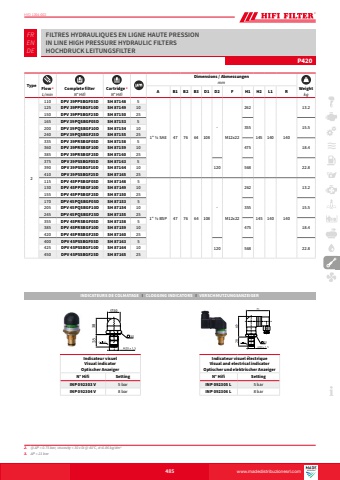 www.hifi-filter.comFILTRES HYDRAULIQUES EN LIGNE HAUTE PRESSIONIN LINE HIGH PRESSURE HYDRAULIC FILTERSHOCHDRUCK LEITUNGSFILTERFRENDEHYD 1204-002P4204852. @ %u2206P = 0.75 bar, viscosity = 30 cSt @ 40%u00b0C, d=0.86 kg/dm33. %u2206P = 21 barType Flow 2L/minComplete filterN%u00b0 HifiCartridge 3N%u00b0 HifiDimensions / AbmessungenmmWeightkg A B1 B2 B3 D1 D2 F H1 H2 L1 R2110 DPV 39PPSBGF05D SH 87148 51\ 47 76 64 108-M12x22262145 140 140125 DPV 39PPSBGF10D SH 87149 10 13.2150 DPV 39PPSBGF25D SH 87150 25165 DPV 39PQSBGF05D SH 87153 5200 DPV 39PQSBGF10D SH 87154 10 355 15.5240 DPV 39PQSBGF25D SH 87155 25335 DPV 39PRSBGF05D SH 87158 5360 DPV 39PRSBGF10D SH 87159 10 475 18.4385 DPV 39PRSBGF25D SH 87160 25375 DPV 39PSSBGF05D SH 87163 5390 DPV 39PSSBGF10D SH 87164 10 120 568 22.8410 DPV 39PSSBGF25D SH 87165 25115 DPV 45PPSBGF05D SH 87148 51\ 47 76 64 108-M12x22262145 140 140130 DPV 45PPSBGF10D SH 87149 10 13.2155 DPV 45PPSBGF25D SH 87150 25170 DPV 45PQSBGF05D SH 87153 5205 DPV 45PQSBGF10D SH 87154 10 355 15.5245 DPV 45PQSBGF25D SH 87155 25355 DPV 45PRSBGF05D SH 87158 5385 DPV 45PRSBGF10D SH 87159 10 475 18.4420 DPV 45PRSBGF25D SH 87160 25400 DPV 45PSSBGF05D SH 87163 5425 DPV 45PSSBGF10D SH 87164 10 120 568 22.8450 DPV 45PSSBGF25D SH 87165 25Indicateur visuelVisual indicatorOptischer AnzeigerN%u00b0 Hifi SettingINP 092303 V 5 barINP 092304 V 8 barIndicateur visuel %u00e9lectriqueVisual and electrical indicatorOptischer und elektrischer AnzeigerN%u00b0 Hifi SettingINP 092305 L 5 barINP 092306 L 8 bar3830INDICATEURS DE COLMATAGE I CLOGGING INDICATORS I VERSCHMUTZUNGSANZEIGERwww.madedistribuzionesrl.com